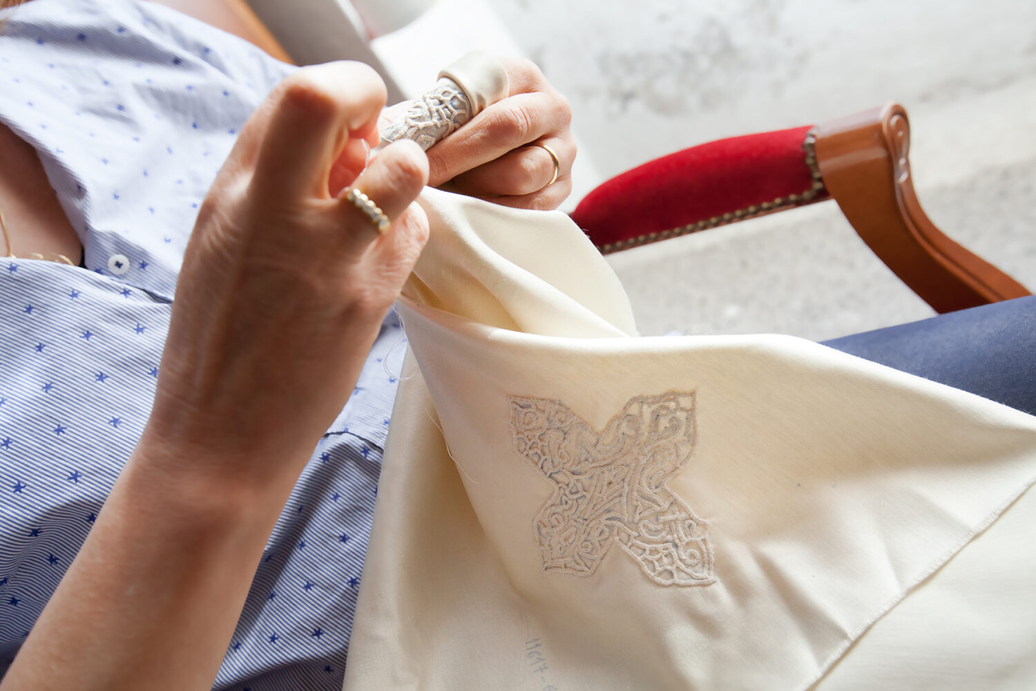 La scelta di affidarsi solo alle mani per realizzare le nostre creazioni è da ricercarsi nel significato che attribuiamo al ricamo a mano: non solo è ciò che continua a legarci di generazione in generazione, ma la sua eterna bellezza ci stupisce alla fine di ogni lavoro.